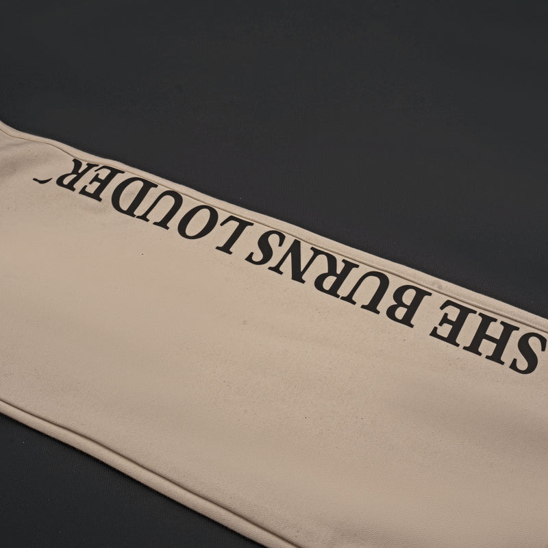 • 💬 Bold leg graphic: “SHE BURNS LOUDER” down the side seam