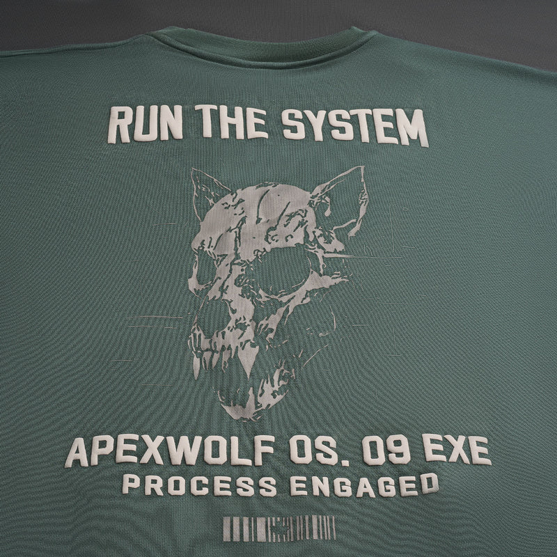 Featuring the “RUN THE SYSTEM” insignia and Apexwolf OS_09 EXE back code, the top stands as a uniform of control, strength, and calculated calm. The inner fleece surface keeps you insulated, while the exterior holds a tactical matte texture — engineered for both movement and endurance.