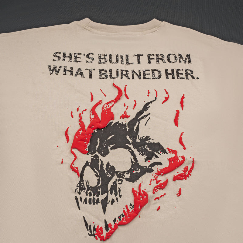 Forged in heavyweight cotton and cut to Apexwolf’s signature oversized fit, this piece channels the heat of resilience. The back graphic, a flaming skull rising through chaos, is emblazoned with “SHE’S BUILT FROM WHAT BURNED HER.” — a visual manifesto of rebirth and strength.