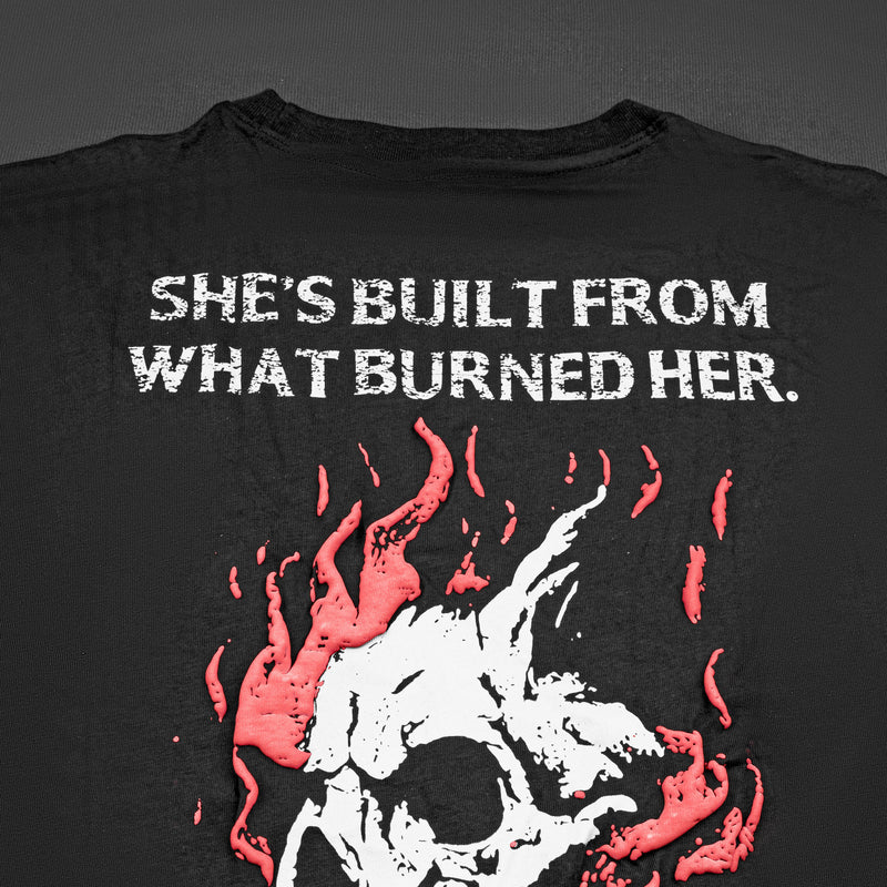 • 💀 Back artwork: “SHE’S BUILT FROM WHAT BURNED HER” skull graphic